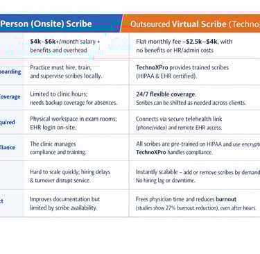 The outsourced model clearly lowers overall costs and overhead. For example, accounting for salary plus benefits can push an on-site scribe’s real cost over $6k–$7.5k/month. In contrast, a TechnoXPro remote scribe costs just 10–15% of that amount. Yet both options deliver better charting, fewer errors, and happier doctors – making the virtual approach often the smarter investment.